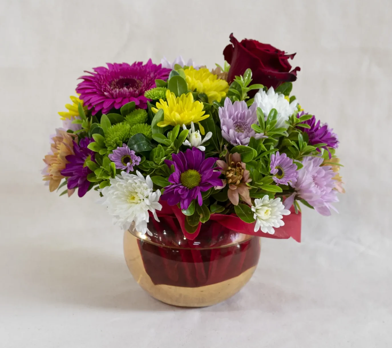 Llena de vida tus espacios con nuestro Jardín de Colores, un arreglo diseñado para quienes aman la diversidad de la naturaleza. Este centro de mesa combina la elegancia de una Rosa Roja central con la energía de una Gerbera Fucsia y la frescura de diversos Crisantemos y Margaritas en tonos amarillos, blancos y púrpuras. Presentado en una delicada pecera de vidrio con detalles en rojo, es el regalo perfecto para un centro de mesa, un escritorio o para desear una pronta recuperación.