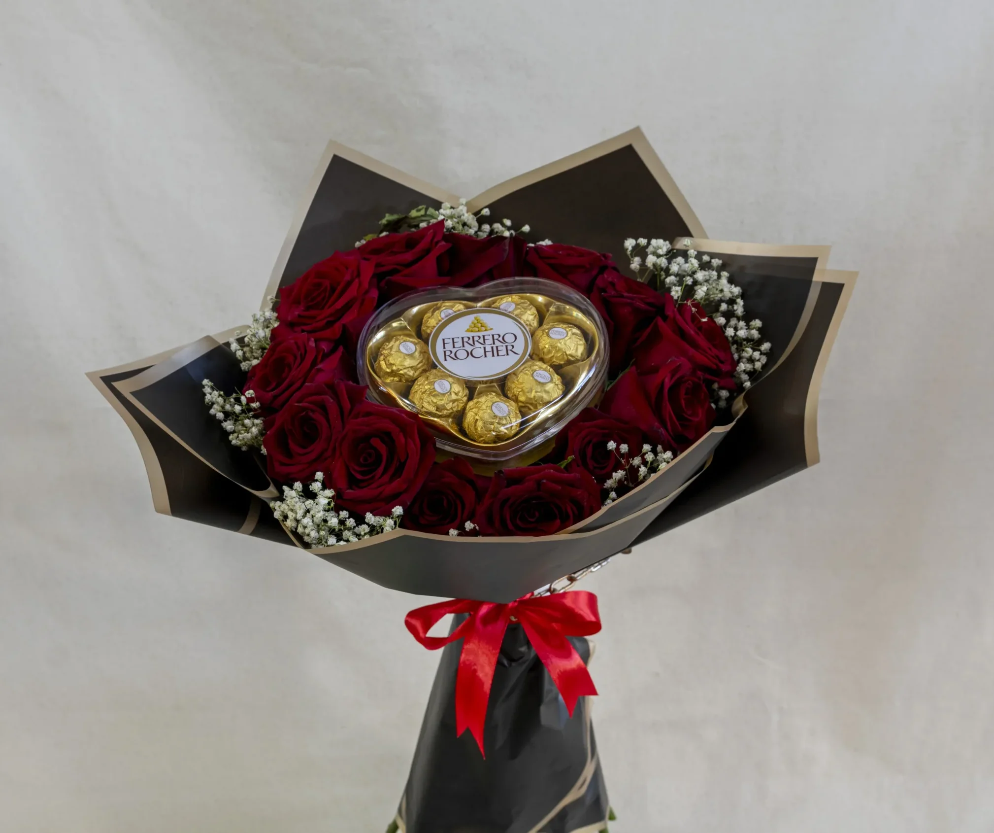Ver productosEl romance clásico se encuentra con el lujo en nuestro Pack Amore. Este diseño exclusivo ha sido creado para impactar, combinando la pasión de rosas rojas aterciopeladas con el brillo dorado de una caja de chocolates Ferrero Rocher en forma de corazón.